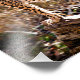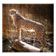 Um jovem guepardo parado num tronco e olhando para a distância. O animal está iluminado de trás pelo sol da manhã.