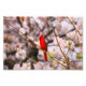 Norte vermelho brilhante Pássaro cardeal com flor rosa ao fundo.
