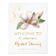 Cartaz de Boas-Vindas da Chuva de Noiva em Aquarela Magnólia Roxo Floral apresenta elegantes flores de magnólia em aquarela em lavanda e roxo suave com folhas verdes em um fundo branco acentuado com dourado com as informações do seu Cartaz de Boas-Vindas da Chuva de Noiva abaixo. Criado para você pelo Evco Studio www.zazzle.com/store/evcostudio