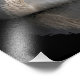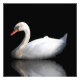 Cisne branco mudo flutuando num lago com reflexo na água contra fundo preto. Chave baixa.