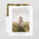 Casamento de orçamento clássico salve a data com um simples e mínimo design preto e branco com uma combinação de fontes serif tradicionais e um roteiro elegante juntamente com sua data em um formato grande para um toque moderno junto com sua foto favorita. O verso tem uma segunda foto para um total de duas fotos. Esta elegante salva a data é excelente para um casamento formal.