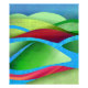 Uma paisagem abstrato com cores e texturas vibrantes mostrando colinas flutuando no gelo em tons de verde, azul, ciano, vermelho e rosa.