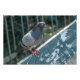A close-up shot of a feral pigeon (Columba livia) standing on the backrest of a weathered green wooden bench. The bird is looking towards the camera, showing its orange eye and iridescent neck feathers against a blurred background of a metal fence and foliage.