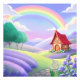 Esta obra de arte digital retrata um mundo de conto de fadas repleto de inocência e magia. A cena é iluminada por um vasto Arco-íris de cores suaves, arqueando sobre colinas cobertas de Lavanda Roxa romântica. Uma pequena e aconchegante cabana com um telhado vermelho vibrante está aninhada nas colinas, com um caminho de pedra serpenteando em direção a ela, criando uma atmosfera quente e pacífica.