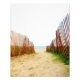 Uma fotografia de um caminho de praia com cerca vermelha de duna.
