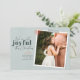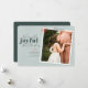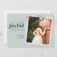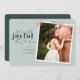 Um cartão de férias moderno com a mensagem "Estamos muito felizes com este Natal" perfeito para anunciar a gravidez da sua família. Personalize com seus nomes, sua imagem favorita e uma mensagem curta. Imagem verde a cores de Jessica Rockowits no Unsplash