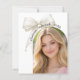 Anuncie seu marco com este Save the Date de Formatura Coquette. O design apresenta um luxuoso arco de marfim adornado com delicadas contas de pérola e um ícone clássico de capelo de formatura. Perfeito para a formanda estilosa que deseja compartilhar seu retrato com familiares e amigos.