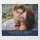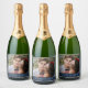 Rótulos Fotográficos de vinho espumante moderno. Esta design apresenta a fotografia da noiva e do noivo e o texto branco com seus nomes, data e local do casamento.
