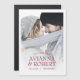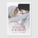 Sua fotografia do casal está em destaque. Depois, uma camada branca transparente é colocada sobre ela para garantir que seus detalhes de casamento possam ser vistos - independentemente das cores em sua foto. Seus nomes estão escritos em um texto chique grande para torná-los realmente pop. Salve a data em um pequeno tipo de letra curvado acima e a data do casamento e a localização abaixo.