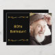 Fundo preto com decoração falsa de ouro. Com o texto: 80 Birthday! na frente. Modelo para sua foto. Um convite de aniversário para homens. Adicione os detalhes do evento no verso.