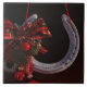 Azulejo cerâmico com uma fotografia com ferradura enforcada adornada, enfeitiçada com uma fita de xadrez de búfalo e decorações de Natal.
