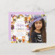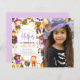Convide a família e os amigos para um tempo espetacular com estes convites de aniversário bonitos de Halloween. O lado esquerdo desta design de orçamento apresenta uma borda pintada à mão de personagens divertidos do Halloween, há crianças em fantasias, gatos pretos, morcegos, abóboras sorridentes, fantasmas, esqueleto de dança, aranhas, balões, estrelas, poções mágicas, crânio de olhos coronários, vassoura voadora, milho doce e muito mais! Dentro no quadro, o nome da aniversariante aparece em letras grandes, com sua idade e detalhes de festas em tipografia elegante. O lado direito mostra uma foto da sua escolha! Adoramos convites para fotos, à medida que eles se dobram como lindas pegadas! O esquema de cores do texto é uma paleta clássica do Dia das Bruxas: laranja, roxo, cinza e preto! As cartas invertem para uma cor púrpura pastel. Escolhemos "CINCO" para a modelo, mas estas cartas são excelentes para uma primeira festa de aniversário ou crianças de qualquer idade! Para personalizar, basta clicar em "Personalizar este modelo" e editar o texto para apresentar as suas próprias informações de celebração! Como parte da seleção orçamentária no Zazzle, esta folha não é um tamanho de convite padrão ou qualidade de papel. Se quiser que este design num cartão de convite o encontre na nossa loja ou utilize o Zazzle Make Machine para o transferir para o produto da sua escolha. Se tiver alguma pergunta, por favor, não hesite em chegar até lá - eu ficarei feliz em ajudar! Basta notar que não posso modificar uma ordem existente. Navegue na coleção acima ou visite minha loja para ver mais convites de aniversário do Dia das Bruxas.