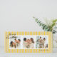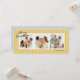 Pequenas faixas verticais amarelas ensolaradas e pálidas cinzas dão a este cartão de feriado de três fotos uma vibração moderna e chic com fontes clássicas e uma longa mensagem personalizada para amigos e familiares.
