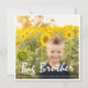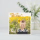 Que bom que esperamos o cartão de anúncio de gravidez fotográfica Big Brother com azul no verso.