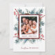 Esta elegante e personalizável carta de festas mostra elegantes botânicos do inverno com cores aquáticas pintadas manualmente nos tons de verde, azul e vermelho. que lindamente enquadram sua foto. Vem com um padrão correspondente no verso e uma sala para escrever seus cartões de natal personalizados. O texto personalizado (Feliz Natal, seu nome familiar e saudações) está na tipografia clássica, junto com uma letra elegante e cor vermelha de amora em fundo branco de neve.