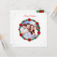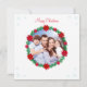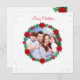 Foto da família personalizada e bonita, coroa de pinho decorada com poinsetos e flocos de neve Cartão de Saudação de Natal. Texto pronto para ser personalizado.
