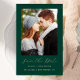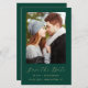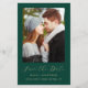 Este simples e minimalista Cartão Salvar a Data apresenta uma foto vertical acima das palavras "Salvar a Data" em um elegante roteiro de escrita manual dourada, seguido pelos nomes do casal, data do casamento e cidade em sans serif em um fundo verde esmeralda. Adicione uma mensagem mais detalhada com informações adicionais sobre o contrário.