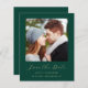 Este simples e minimalista Cartão Salvar a Data contém uma foto quadrada acima das palavras "Salvar a Data" em um elegante roteiro de escrita manual dourada, seguido pelos nomes do casal, data do casamento e cidade em sans serif em um fundo verde esmeralda. Adicione uma mensagem mais detalhada com informações adicionais sobre o contrário.
