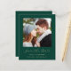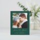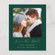 Este simples e minimalista Cartão Salvar a Data contém uma foto quadrada acima das palavras "Salvar a Data" em um elegante roteiro de escrita manual dourada, seguido pelos nomes do casal, data do casamento e cidade em sans serif em um fundo verde esmeralda. Adicione uma mensagem mais detalhada com informações adicionais no verso, juntamente com um código QR que envia convidados para o seu site de casamento.