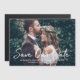 Anuncie sua data de casamento para a família e amigos! Este casamento moderno salve a data do anúncio design apresenta uma foto horizontal do casal noivo na frente com uma cobertura branca de um roteiro de caligrafia "Salvar nossa Data" e um monograma de nomes de noivas e noivos e data de casamento que podem ser personalizados. Nota, a cor do texto branco pode ser modificada.