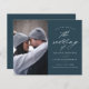 Um casamento com fotos elegante no orçamento 2 salve o cartão de data com caligrafia, uma foto vertical e um texto clássico na frente. O verso tem um site horizontal de fotos e casamentos para os convidados obterem mais informações. Clique no botão editar para personalizar este design.