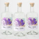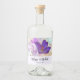 Etiquetas de líquido com uma fotografia adorável de um pote de vidro de dentro de roco roxo escuro. Uma flor roxa leve está presente no fundo.