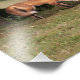 Uma raposa adulta repousa antes de três jovens na borda da floresta.
