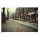 Uma cena de rua autóctone, imbuída de uma melancolia suave. Folhas caídas formam um tapete rico e texturizado através da calçada e da estrada, suas vibrantes tonturas de vermelho, laranja e marrom no pico da estação. Vestir a rua, árvores maduras permanecem sentinelas silenciosas, seus galhos talvez começando a derramar sua folhagem final, moldando a vista. Ao fundo, os edifícios sobem, a sua arquitetura sugere um sentido de história e permanência contra a beleza transitória da estação. Luzes de luz são visíveis, sua presença é uma sutil promessa de iluminação à medida que a luz do dia começa a apagar, ou talvez um brilho suave na névoa matinal. Carros navegam pela via, seus movimentos acrescentando um elemento dinâmico à cena do contrário, seus faróis ou faróis traseiros talvez pegando a luz difusa. A atmosfera geral é de uma contemplação tranquila, um momento suspenso no tempo onde a beleza do ciclo da natureza está no cheio, evocando um sentimento de nostalgia e a aceitação pacífica da mudança.
