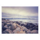 Uma visão panorâmica de um litoral rochoso com uma vasta extensão de água se estendendo a distância. O céu é um roxo macio, mutado, com nuvens sábia, e um bando de pelicanos voa em formação através da armação. O primeiro plano é dominado por grandes cinzas e pedras castanhas, povoadas pelo mar. A água é calma e reflexiva, com um tom de azul à distância. A imagem foi tirada em Pebble Beach, Califórnia.