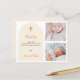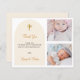 Um cartões de agradecimentos de batismo moderno e elegante. Um fundo branco e ouro chic decorado com uma cruz dourada falsa e uma armação de arco. Personalize e adicione suas duas fotos das crianças, obrigado nota e nome. Sexo neutro.