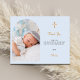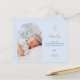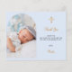 Um cartões de agradecimentos de batismo moderno e elegante. Um fundo azul claro. Personalize e adicione sua foto da criança, obrigado nota e nome. Quadro de fotos em arco
