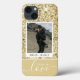 Este é o caso Love Custom Photo Girly Dourado Glitter iPhone 13 com caligrafia branca dizendo na parte inferior. Adicione sua foto de casal favorita ao modelo de foto.