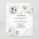 Para um elegante e romântico 10º aniversário de casamento. Um fundo branco decorado com flores, rosas e rendas brancas. Personalize e adicione sua foto, nomes e detalhes. 1 folha = 1 convite impresso de borda a borda.