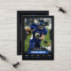 Crie um cartão de troca único e memorável para comemorar um jogador de futebol americano de destaque! Este design personalizável apresenta um esquema de cores azul e preto elegante com um fundo preto texturizado, fazer perfeito para as estatísticas e imagens de qualquer jogador.