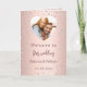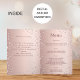 Um gradiente de ouro rosa falso com diamantes cor-de-rosa. Texto de boas-vindas, foto, programa, menu e um aviso de agradecimento no verso.