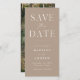 Anuncie sua data de casamento com esta na moda, foto moderna, salve o cartão de data. O design apresenta "Salvar a Data" na parte frontal em fontes de script e serif brancas com um plano de fundo taupe. Personalize o minimalista para salvar o anúncio de data adicionando seus nomes, data e local do casamento. A placa reverte para exibir sua foto favorita do noivado. A simples salvação do anúncio de data é perfeita para qualquer tema de casamento.