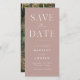 Anuncie sua data de casamento com esta na moda, foto moderna, salve o cartão de data. O design apresenta "Save the Date" (Salvar a data) na parte frontal em fontes de script e serif brancas com fundo rosa poeirento. Personalize o minimalista para salvar o anúncio de data adicionando seus nomes, data e local do casamento. A placa reverte para exibir sua foto favorita do noivado. A simples salvação do anúncio de data é perfeita para qualquer tema de casamento.