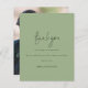 Foto Do Script Sage Green Wedding Obrigado. Um alternativo de 4,5 pol x 5,6 pol com preço inferior. Disponível em um STOCK DE CARTÃO SEMI-GLOSS 110 lb, que é a opção padrão (mais espesso para convites), OU um STOCK de PAPEL THINNER FINISH 80 lb FINISH (ideal para gabinetes). Os envelopes são um extra opcional e são ligeiramente maiores que o tamanho da placa. Um design de tipografia minimalista com um script de estilo de letra de na moda definido para Obrigado. No verso, substitua a imagem por sua favorita do dia como guardiã para seus convidados. Personalize facilmente o resto do texto com sua mensagem e nomes.