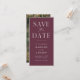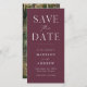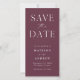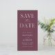 Anuncie sua data de casamento com esta na moda, foto moderna, salve o cartão de data. O design apresenta "Salvar a Data" na parte frontal em fontes de script e serif brancas com um fundo de vinho/roxo. Personalize o minimalista para salvar o anúncio de data adicionando seus nomes, data e local do casamento. A placa reverte para exibir sua foto favorita do noivado. A simples salvação do anúncio de data é perfeita para qualquer tema de casamento.