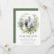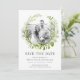Nosso Wild Meadow salva os quadros do cartão de data da sua foto favorita do noivado com uma coroa redonda de verde-aquarela pintada em tons de primavera verde-verde, azeitona e samambaia. Uma escolha moderna, porém orgânica, para casamentos de primavera ou de verão que apresentam folhas verdes frescas na cor do ano de 2017. Personalize com seus nomes, data do casamento, local e site de casamento usando os campos fornecidos.