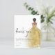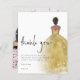 Foto De Cabelo Escuro Da Rapariga Gown Dourada Quinceañera Obrigado. Um alternativo de 4,5 pol x 5,6 pol com preço inferior. Disponível em um STOCK DE CARTÃO SEMI GLOSS 110 lb, que é a opção padrão (recomendada para convites), OU um STOCK DE PAPEL THINNER SATIN FINISH 80 lb (ideal para gabinetes). Estilo elegante para o seu obrigado de festa de aniversário, você com a visão de fundo de uma garota de cabelos escuros em um lindo vestido de ouro brilhante à direita, e Obrigado em um roteiro de estilo manuscrito. Personalize facilmente o resto do texto para seus próprios detalhes. Substitua a foto da amostra no verso por uma favorita da sua festa.