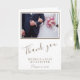 Um cartão de casamento de favor com uma foto de casamento personalizada, os nomes da noiva e do noivo e a data de casamento no lado da frente. Sua mensagem pessoal é dentro - mude ou deixe. Um obrigado elegante e na moda, cartão com fotos, excelente para seus convidados. Obrigado " em uma fonte moderna de script e obrigado personalizado você envia uma mensagem. Adicione sua foto favorita de casamento ao modelo.