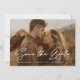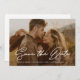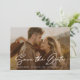Este simples e na moda, casamento de fotos moderno, salve a data da placa simples modelo de 'Salvar a Data' em um roteiro animado e moderno com seus nomes, data e local de casamento em uma linha de solteiro abaixo dela. O texto na frente é branco nítido. A forma padrão da placa é cantos nítidos padrão, mas cantos arredondados também funcionam maravilhosamente com este design, então tente ambos os modos de edição e veja qual é o seu rico! No verso, escolhemos uma ordem atípica para a informação, colocando o texto 'por favor, salve a data' depois do texto 'para o casamento de', que lhe dá um charme menos viajado. Você pode mudar facilmente esta ordem ou qualquer outra coisa para atender às suas necessidades. No verso, definimos o fundo como transparente para deixar a cor do papel simplesmente servir como o tom base. Mas você pode mudar isso facilmente selecionando uma das cores básicas nas ferramentas de edição ou digitando um número de cor se você tiver uma matiz específica em sua pesquisa, ou olhando para a ferramenta do espectro de cores e escolhendo algo à vista. O tom de texto padrão no verso é preto, mas você pode editá-lo a favor de outra cor de texto e também pode alterar qualquer fonte no verso. O tipo de papel padrão é compatível, mas você pode alterar isso para semirbrilho ou outro tipo de papel se preferir outra aparência. Use as ferramentas intuitivas de edição e design, sua foto favorita e sua inspiração para fazer com que este casamento de fotos simples salve o cartão de data exclusivamente seu!