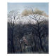 Uma bela paisagem florestal com duas figuras em cavalo visíveis através da folhagem da floresta.