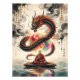 Uma obra de arte digital que retrata um monge em meditação em uma plataforma de madeira, de frente para um majestoso dragão preto e laranja enrolado em torno de um orbe vibrante e giratório. A cena é ambientada contra um pano de fundo de caligrafia tradicional asiática e nuvens de tinta lavada, evocando temas de harmonia espiritual, equilíbrio e o encontro do terreno e do divino.