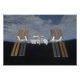 A Estação Espacial Internacional, recuada pela escuridão do espaço e do horizonte da Terra.