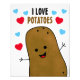 Batata marrom divertida e feliz cercada por corações de amor vermelhos e azuis com Eu Amo Batatas em letras pretas e marrons acima de sua cabeça.