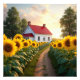 Uma cena pitoresca de uma quintal fazenda branca com um telhado vermelho aninhado dentro de um campo de girassol vibrante no nascer do sol.