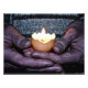 Mãos idosas acariciando um ovo de vela, protegendo-o.