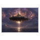 An immense floating island crowned by a grand, spired castle city gleams amid turbulent purple-orange clouds, with powerful golden light beams pouring downward to touch a serene ocean surface. Stars scatter across the night sky while a low sunset horizon warms the edges in peach and rose, creating layers of depth, mystery, and radiant energy. The composition evokes mythic grandeur, cosmic power, ancient legends reborn, sublime wonder, and the thrill of impossible realms—perfect for fantasy bedrooms, gaming rooms, meditation spaces, home offices, modern minimalist walls, or as awe-inspiring gifts for dreamers, fantasy enthusiasts, spiritual seekers, or anyone drawn to epic scale, surreal beauty, and transformative imagination.